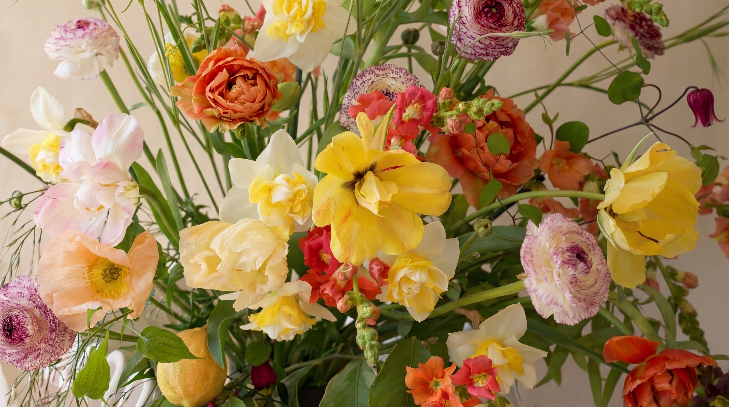 A bright, textural mix of spring florals in soft peach, blush, coral, butter yellow, and lavender tones. Expect layered garden roses, ranunculus, peonies, sweet pea, and seasonal accents—designed with movement, fullness, and a fresh, just-gathered feel.